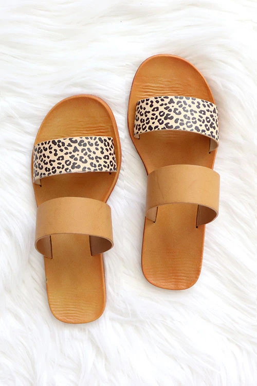 Animal Print Mixed Two Strap Band Sandals-Brown & Cheetah Leopard Print