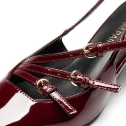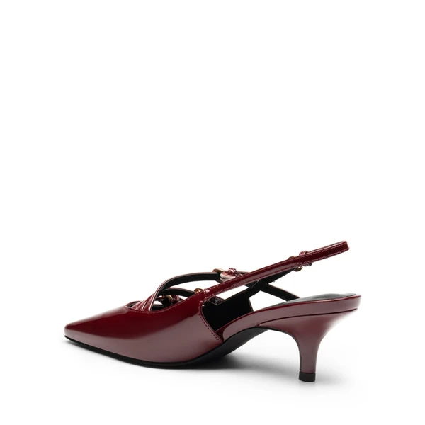 Turn heads with these modern buckle slingback heels. Featuring a kitten heel and an elongated pointed toe, this shoe radiates timeless elegance or cool girl vibes – depending on your mood! The strappy front lends a dash of sophistication, while the glossy upper elevates the overall look. Whether paired with bare feet for a sleek, minimalist look, layered with tights for added warmth, or style with trendy socks to capture the perfect influencer vibes.