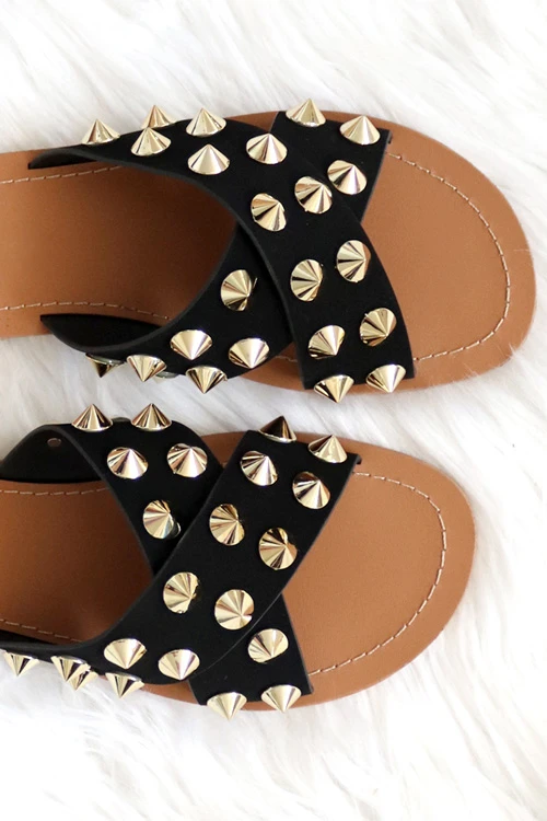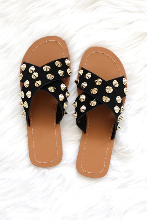 Cross band sandals. X bands with large studded detailing. Add a little flair to your look with these stylish slides!