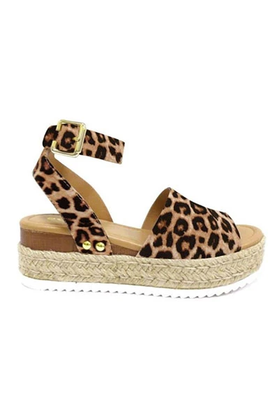 Espadrille platform flats. Gorgeous leopard print. Open toe. Ankle strap with buckle closure. Flat low espadrille wedge sole adds the perfect height to your look, but keeps it ultra comfortable. Every girl needs a pair of these this season!