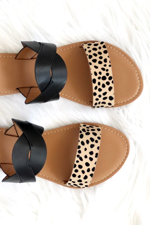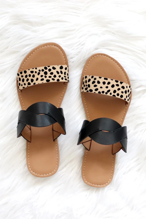 Twisted two band sandals. Two bands across the top. One solid band that is beautifully braided, and one band in a fun animal print. Open Toe. Flat Sole.