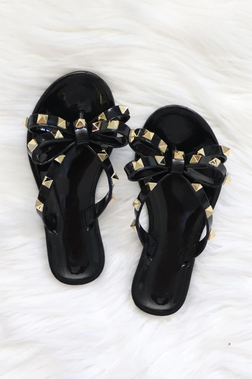Kids Sandals. Super fun flip flop sandals. Jelly material. Adorable bow detail. Studded accent along the straps and bow. These fun shoes add a little flair to any outfit! Perfect with a casual t-shirt and shorts look or a cute summer dress. The best part…these are available in matching adult sizes!