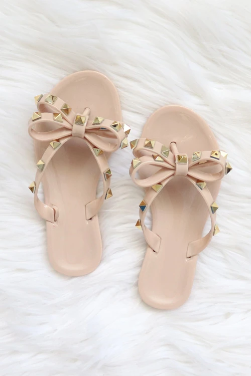 KIDS Girls Studded Bow Flip Flops Jelly Sandals-Nude Beige