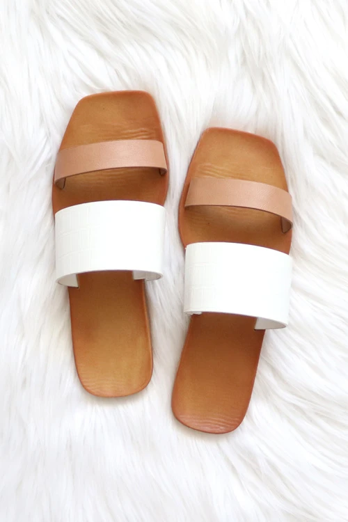 A basic and chic pair of sandals that can be worn every day! Two bands across the top. A fun mix of colors – one thinner strap and thicker strap. A Gorgeous combination of neutral colors. Open Toe. Flat Sole.