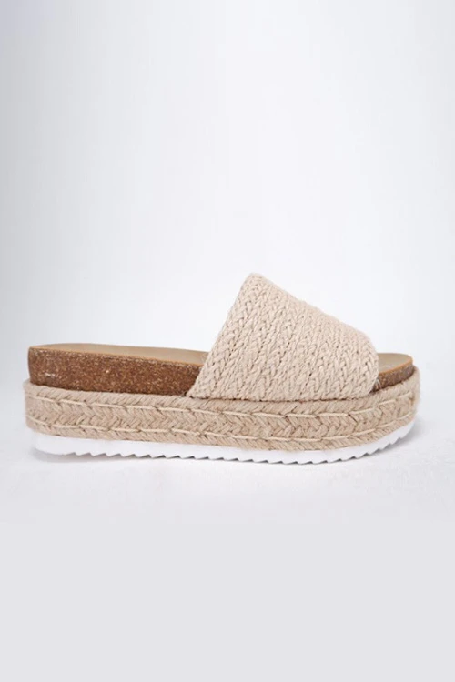 Espadrille flat platform sandals. Single band strap in a natural raffia material. Open toe. Easy slip on style. Flat espadrille wedge sole adds the perfect height to your look,