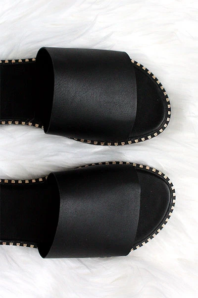 Single band sandals. Solid band with gold trim along the border of the sole. The perfect basic slides with just a little extra detail to make these stand out! Soft cushioned sole. Effortless and comfortable. Grab a pair of these affordable must have sandals – we promise you’ll be wearing them all season!