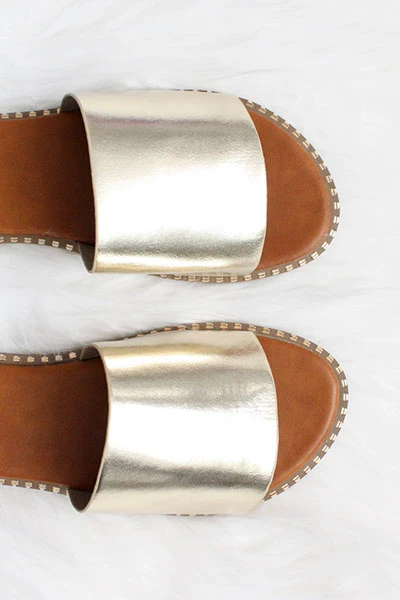 Single band sandals. Solid band with gold trim along the border of the sole. The perfect basic slides with just a little extra detail to make these stand out! Soft cushioned sole. Effortless and comfortable. Grab a pair of these affordable must have sandals – we promise you’ll be wearing them all summer!