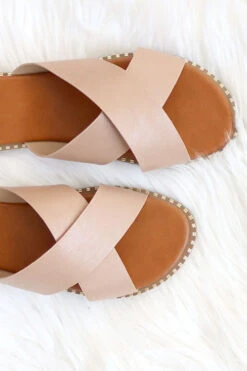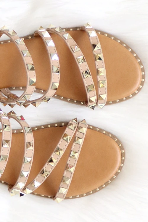 It’s all in the details! Stylish strappy studded sandals. Four strap design with horizontal and diagonal studded straps. Taupe straps with gorgeous studded detail. Slip on style. Round studded trim along the border of the sole.