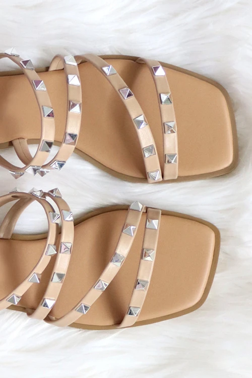 It’s all in the details! Stylish strappy studded sandals. Four strap design with horizontal and diagonal studded straps. Taupe straps with gorgeous studded detail. Slip on style.