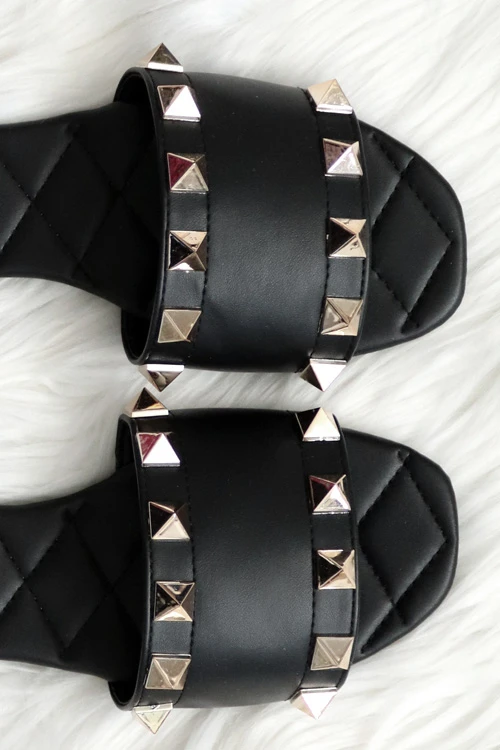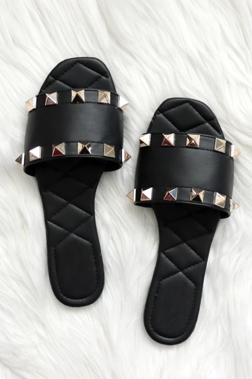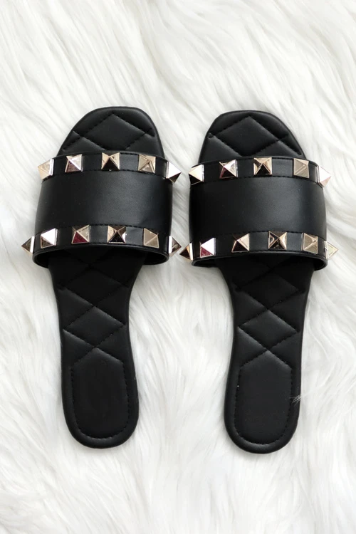 Single band sandals. Stylish studded detail at the top and bottom border of the band. The perfect pair of sandals with just a little extra detail to make these stand out! Effortless and comfortable.Â