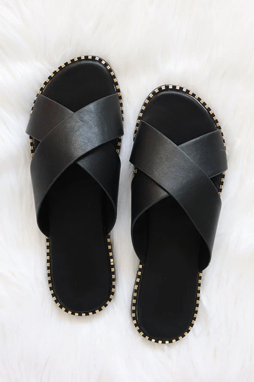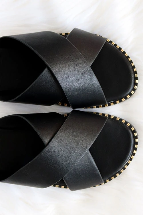 X cross band sandals. Gold trim along the border of the sole. The perfect basic slides with just a little extra detail to make these stand out! Soft cushioned sole. Effortless and comfortable. Grab a pair of these affordable must have sandals – we promise you’ll be wearing them all season!